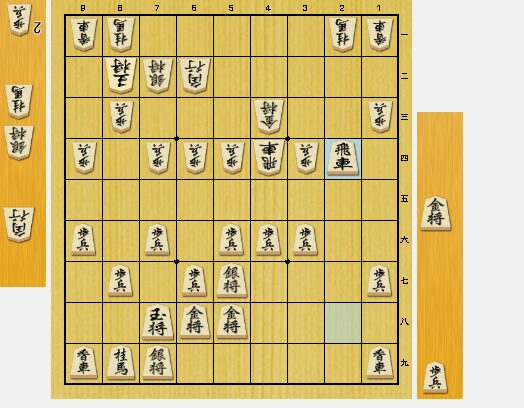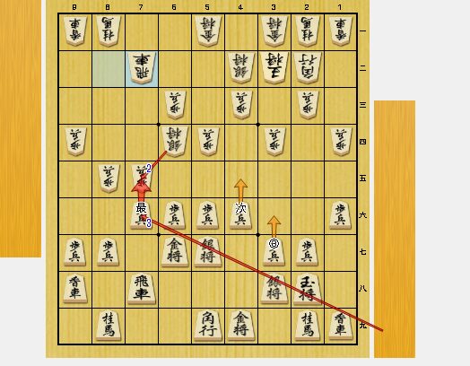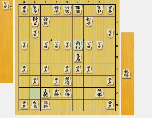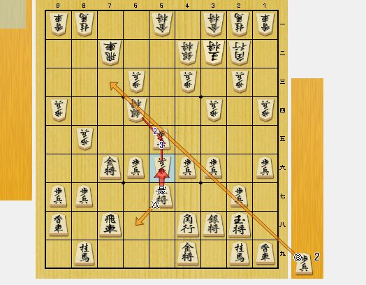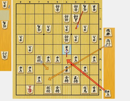 図1の7二飛車寄りに対しては、7五歩と取る1手でした。この手をウッカリして、私は、4八角と意味のない角上がりをしました。