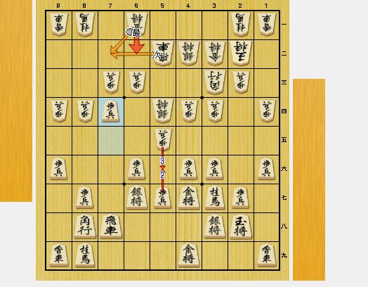 図1で、相手の方が8四歩と突かれたのを見て、7四歩と仕掛けました。飛車で、この歩を取る狙いです。