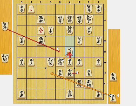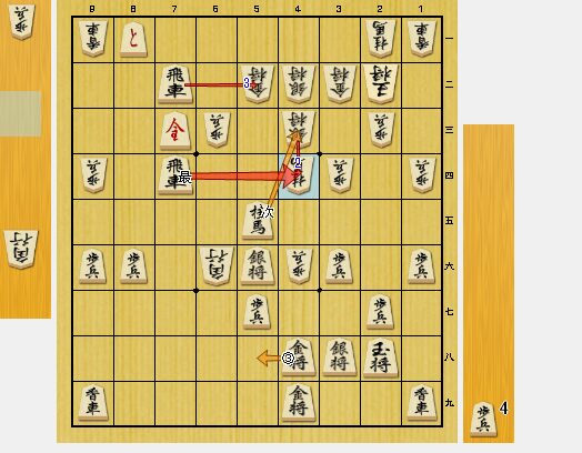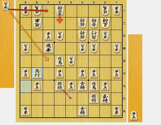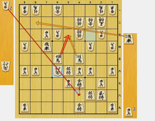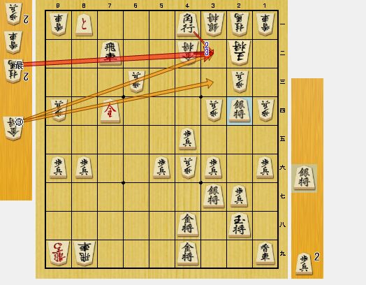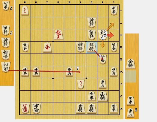 図2では、5三桂成が厳しい攻めになっています。受けが難しいので、相手の方は、8六飛車と飛車角交換してきました。