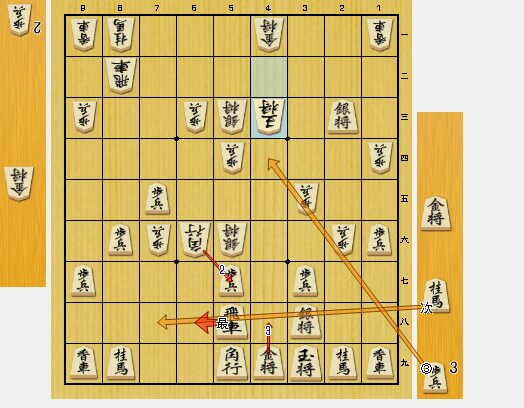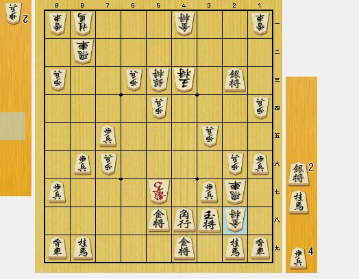 図3の4五桂は、角をさばくための強引な桂跳ねです。タダで取られてしまいますが。6六角と出る手に期待しています。