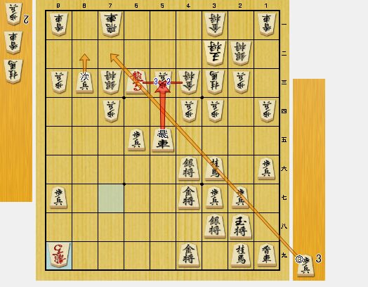 同飛車には3八角打の飛車銀両取り