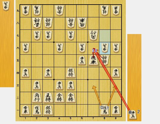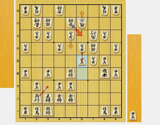 図1で、6五歩と仕掛けたのですが、この手は勇み足でした。ここでの最善手は、7三桂と跳ねる手でした。