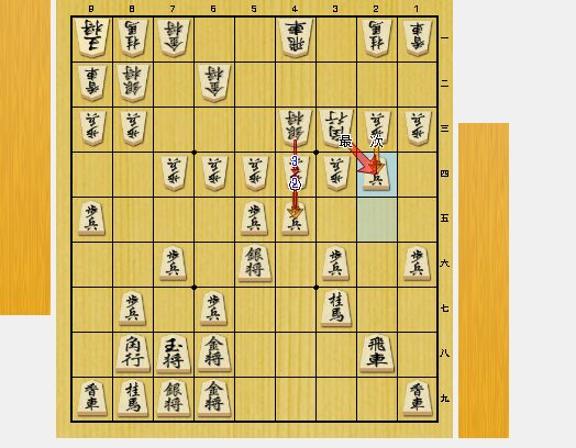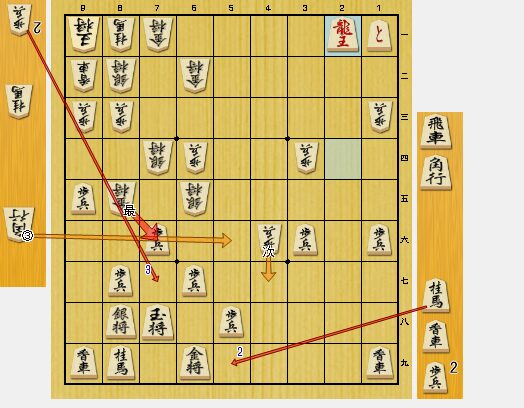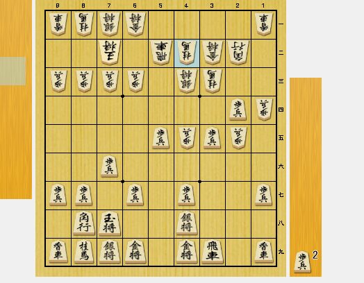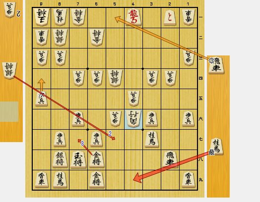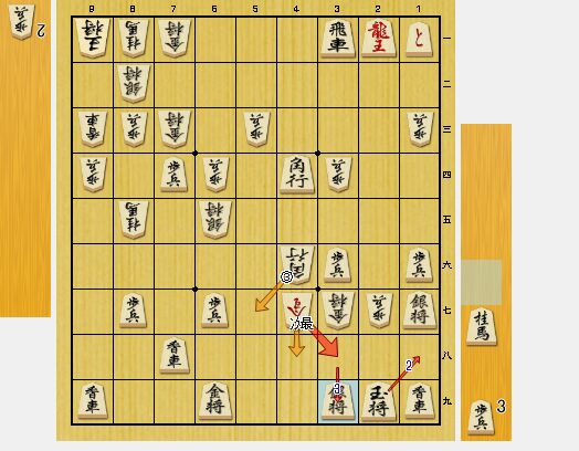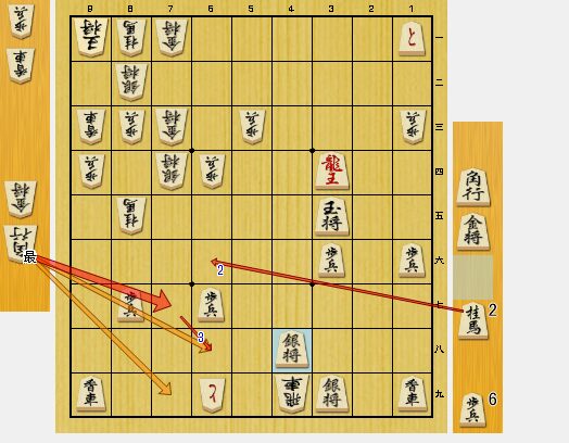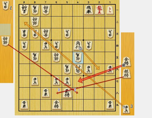 図2では、4九桂打という手がありました。5三歩成と3七角成の両方を受けています。しかし、この手が見えず、私は、7四角成としてしまいました。