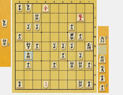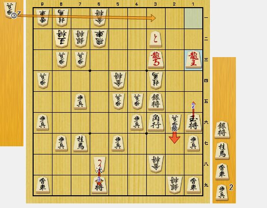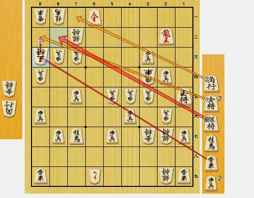 図8では、相手の方から王手龍を決められてしまいました。しかし、入玉ではなく、相手の玉を詰ませに行く方針に切り替えたので、仕方のないところです。