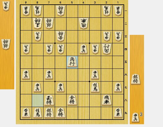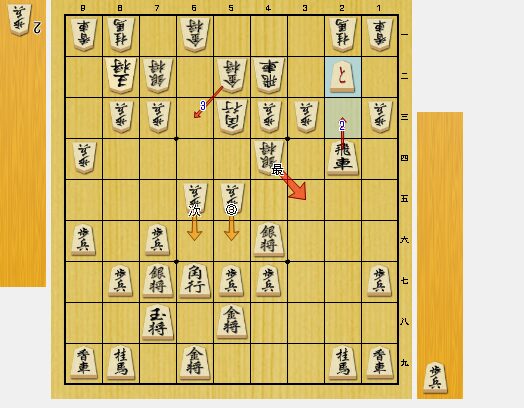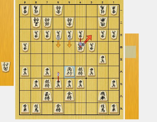 この角打ちは、3四歩を狙っています。相手の方は、3三銀と引かれました。私は、3五歩から追撃しました。