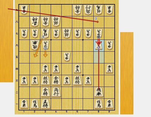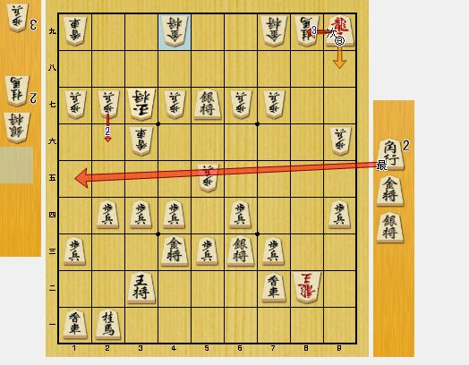 かなり変則的な戦法でしたが、図1では私が有利です。8六同歩・同飛車・8八歩打・8七歩打に3五歩と飛車をぶつけてこれました。飛車交換は損なので、8二飛車と引きました。