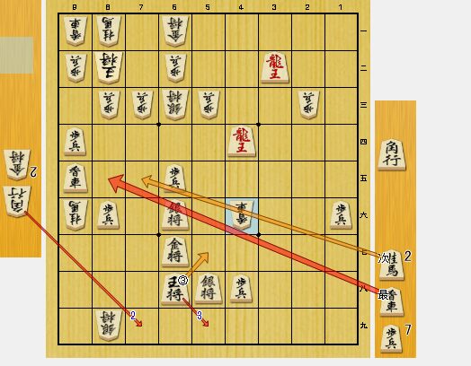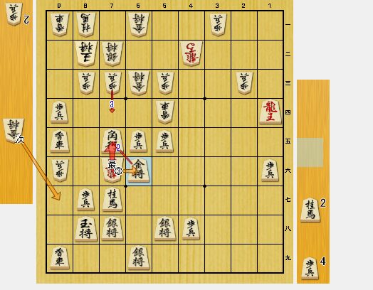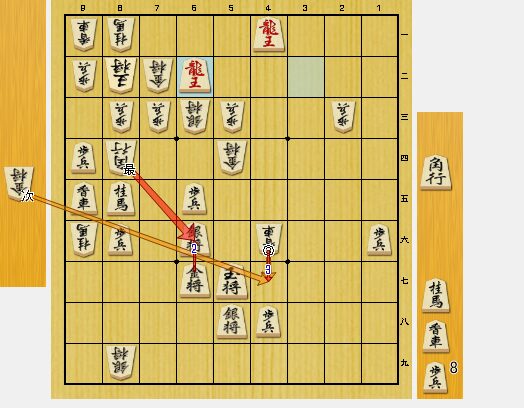 図94六香打は、相手の方の悪手でした。狙いは、同龍ならば、7九角打で王手龍をかけるというものです。しかし、5七玉と上部に脱出することができました。