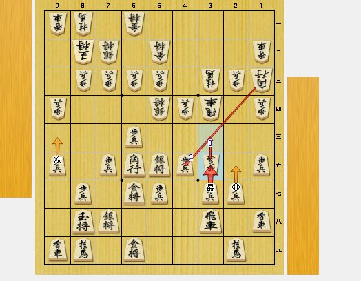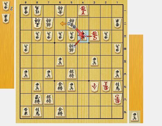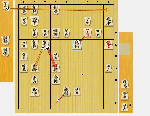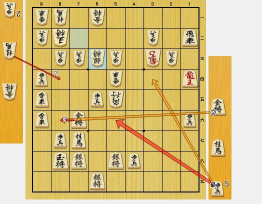 図2では、相手の桂馬は成桂となり、私の桂馬は取られる運命です。駒損が確定しました。そこで、4三歩打と金作りに期待しました。