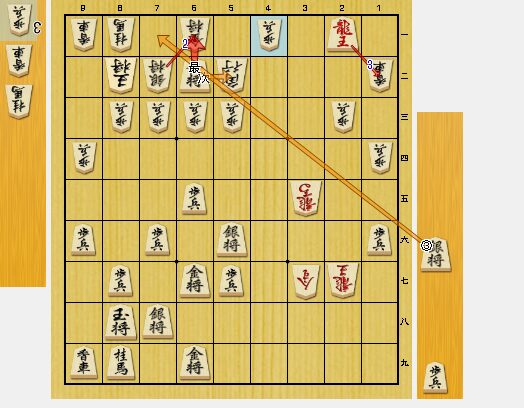 相手の方は、この手に気づかず、7七金と取ってきました。お互いに、この手は見えていなかったようです。