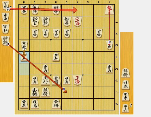 図84四角打は、疑問手でした。寄せに来ている相手に、駒を渡してしまうからです。しかし、2枚の飛車を使わないと勝てないと思い、決断の一手でした。