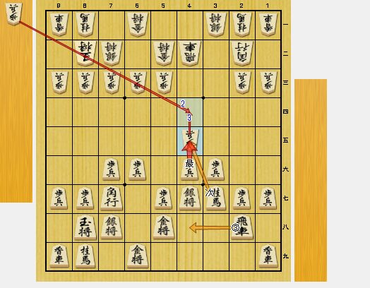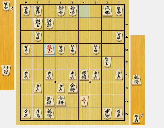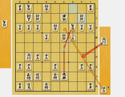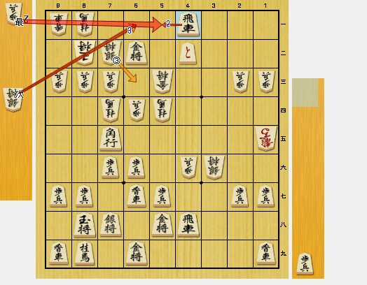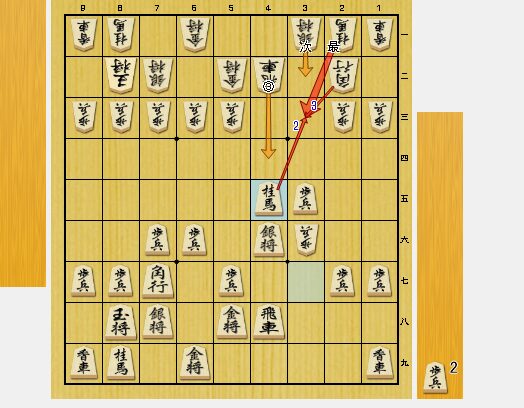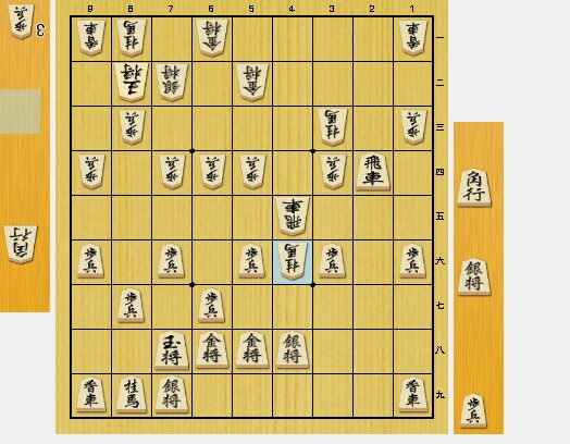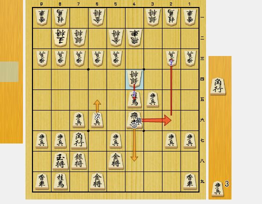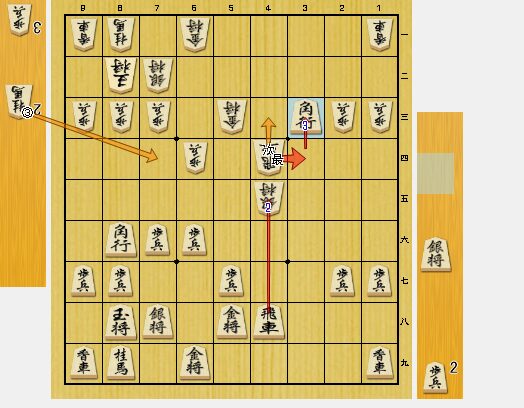 図2では、相手の方が、3六歩と桂頭を狙ってきたのですが、4五桂と跳ねて、歩切れです。相手の方は、3七歩成から、5五角と出てきました。
