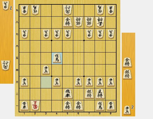 私は、3三桂と跳ねて、遊び駒の活用を図りました。これも、私が有利です。