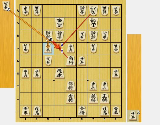 図1は、棒銀を相手にせずに、中央で動こうという作戦です。3五歩・5六歩・2四歩・同歩・3五歩・5五角と飛車取りに出て、私が有利になりました。