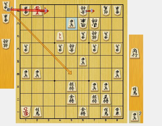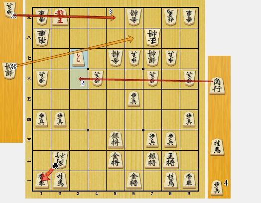 銀を犠牲にして、飛車を成りこむことに成功しました。図4では、と金もできて、私が優勢です。