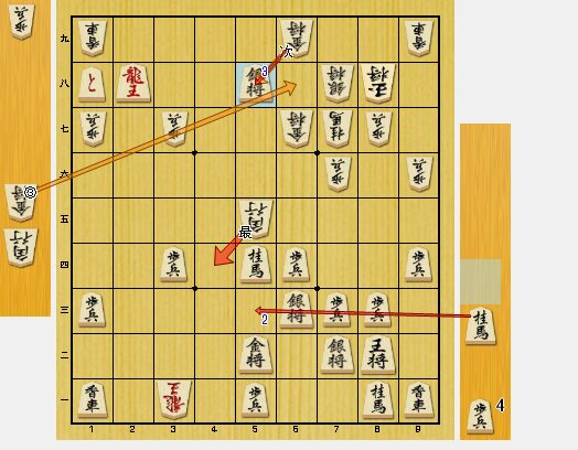 図3での正着は、3五角とぶつける手でした。私は、4五同桂と取ってしまいました。これで、相手に桂馬を渡すことになりました。