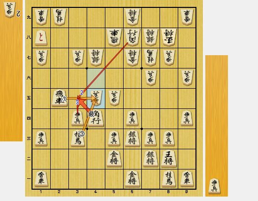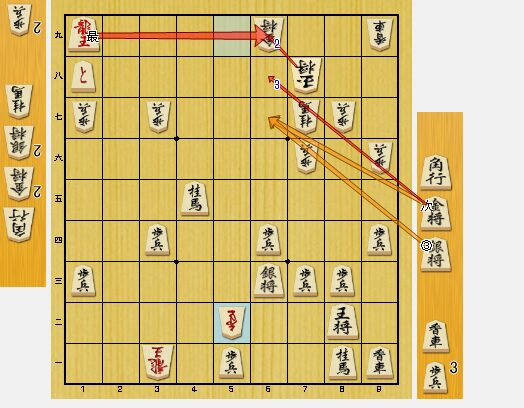 図7で、5四角と桂馬を取った手が相手の方の緩手でした。6七金・6三角成・7八金が王手になり、金銀2枚とることができました。
