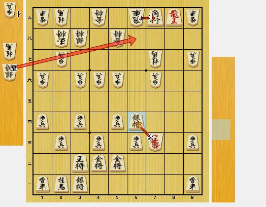 相手の方は、3六歩と受けてきたのですが、ここでポカが出ます。私は、3八龍と銀を取りました。馬が利いていることに気づいていなかったです。