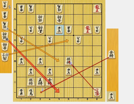 図7では、3五金打で優勢でした。しかし、追っていったときに詰めろをかける手が見えませんでした。しかし、5七歩成と普通に金を取る手が詰めろだったのです。