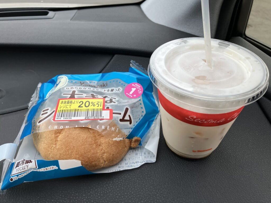 ドリンクは、セーコーマートさんのアイスカフェラテです。アイスがおいしいシーズンになりました。アイスカフェラテが、140円と安いのはセーコーマートさんだけです。