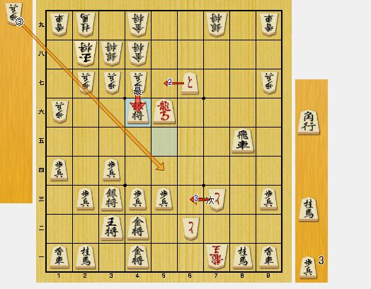 図7で、5一歩と打たれていたら、互角でした。角が利いているので、同龍とは取れません。