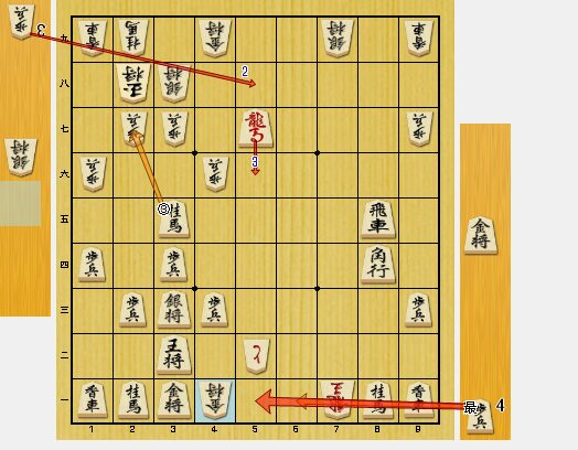 図3で、6五同飛車と歩を取ったのも、悪手でした。正着は、8五歩打でした。同飛車に7七桂と跳ねて、6五桂馬と活用すべきでした。