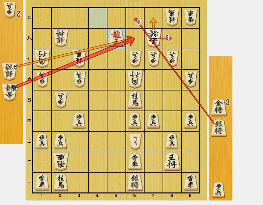 図8で、6八金と打たれていたら負けでした。6一銀から迫るしかないですが、斜めがないので、王手がかかりません。しかし、相手の方は6八銀と打たれました。これで、私に勝利の目が出ました。