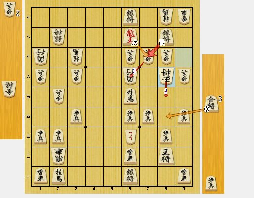 この後の手順は、同桂・7六金打・同玉・7五金打・同角・7七龍・7五龍までです。7六金打とタダで捨てる手が妙手です。