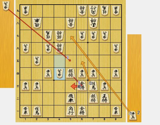 図2の4四歩の突き出しが厳しく、と金が作られてしまいそうです。5三金が最善手ですが、飛車先が重くなるのが嫌でした。