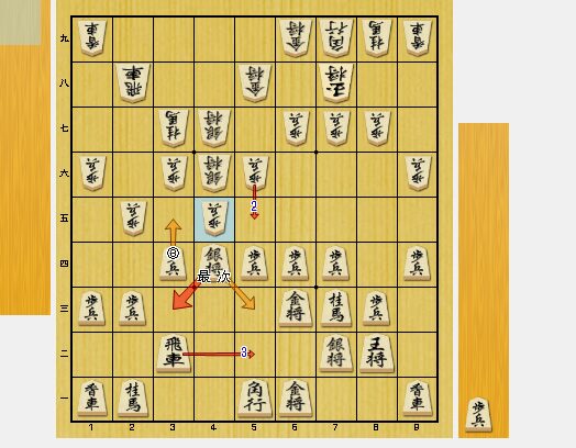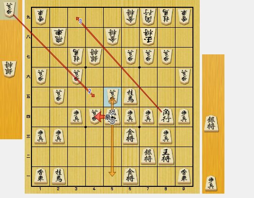 私は、5三飛車と指しました。4五桂馬には、同銀とする予定でした。相手の方は、4五銀とぶつけてこられました。この手は、ありがたいと思いました。