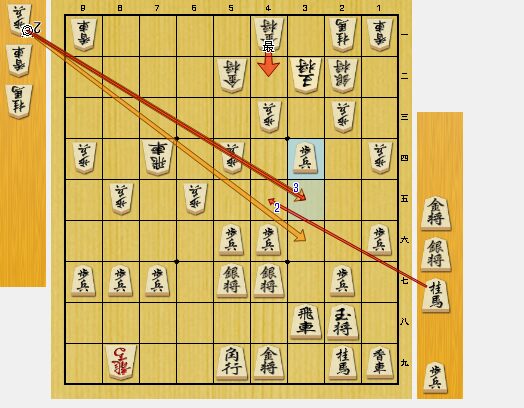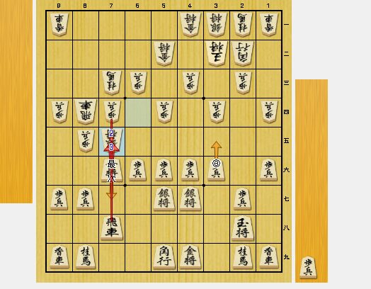 7三桂を飛車で取られないように、7四金打とされましたが、歩がないのでつらい形です。