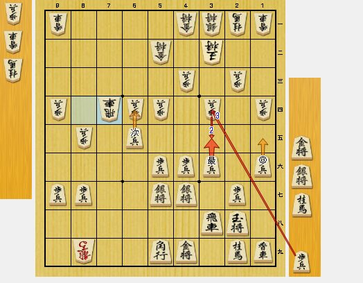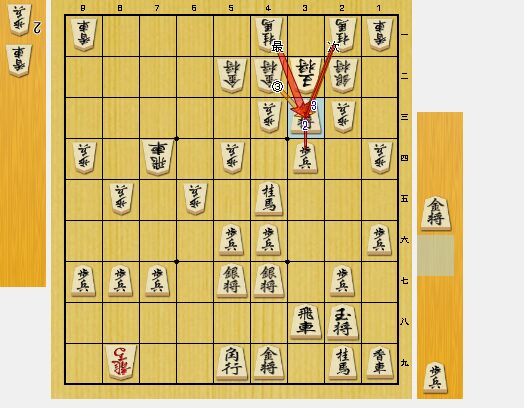 図5で、相手の方が3四歩と取り込ませてくれました。歩が入手できたのが大きいです。これで、私が有利になりました。