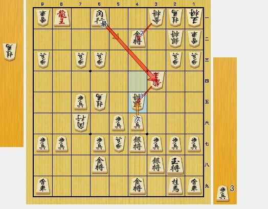 図2では、3五角成が最善手でした。5六歩と取り込まれるのが嫌だったのですが、5三歩とたたけました。