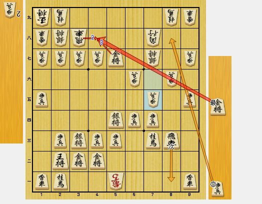 同歩・同金・4九角打に相手の方が、4八飛車と逃げたので、3八角成・同飛車・5四金で、2枚替えとなり、私が有利になりました。