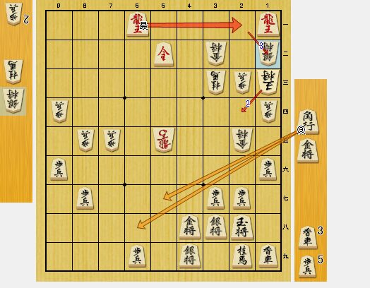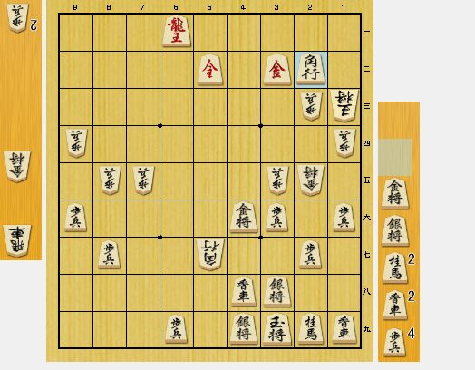 図5では、3二角打で寄りでした。私は、2一金と桂馬を取ったので、3二玉で再び長引きました。