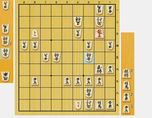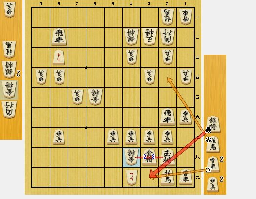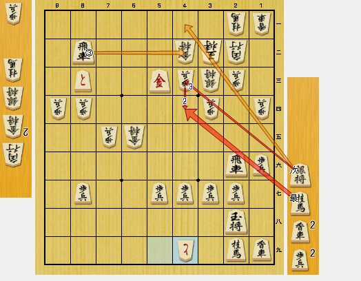 4四桂馬と指されていたら、投了するしかありませんでした。しかし、相手の方が、4二銀成・同銀に3八金と受けてきたので、逆転しました。