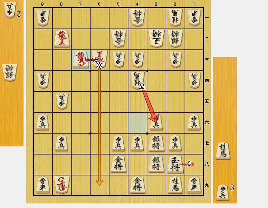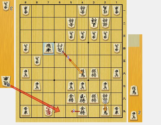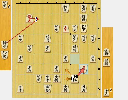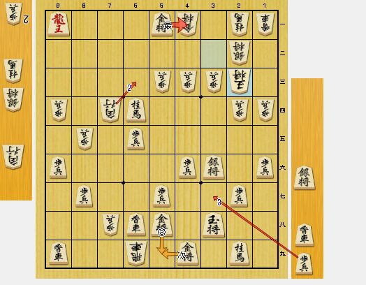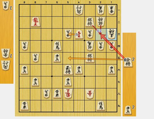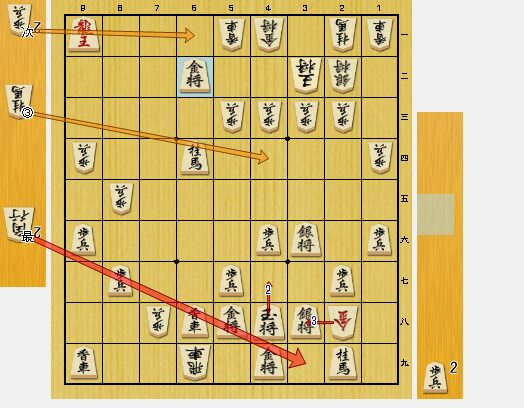 図6で相手の方が指した2三玉に早逃げは、悪手でした。金をタダで取って迫ることができるからです。これで、逆転しました。