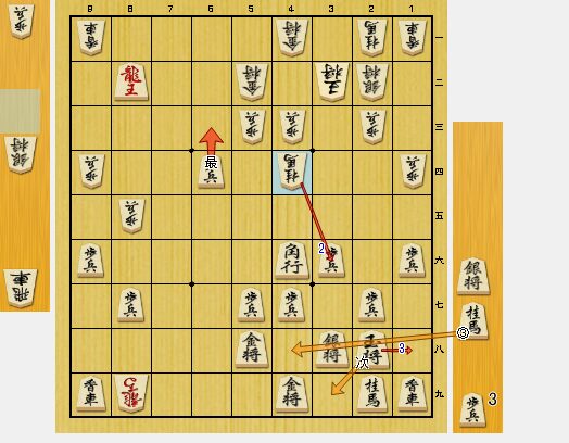 しかし、この詰みを見逃していた私は、4八玉と逃げました。これで、私の劣勢が続きました。