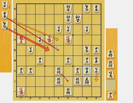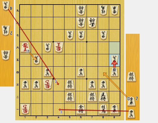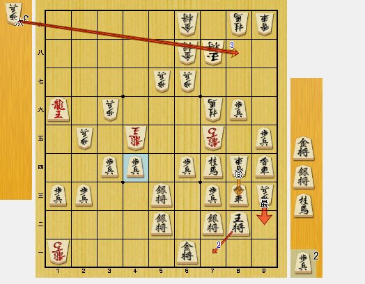 4六龍と引かれた意味が分からなかったのですが、端攻めが相手の方の狙いでした。香車を2枚持っているので、受けられると考えて、同歩と取りました。