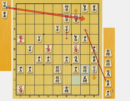 図7では、玉頭攻めが刺さっています。相手の方は、8四香車と攻防の香を打ってきましたが、8七歩成が王手で先手です。