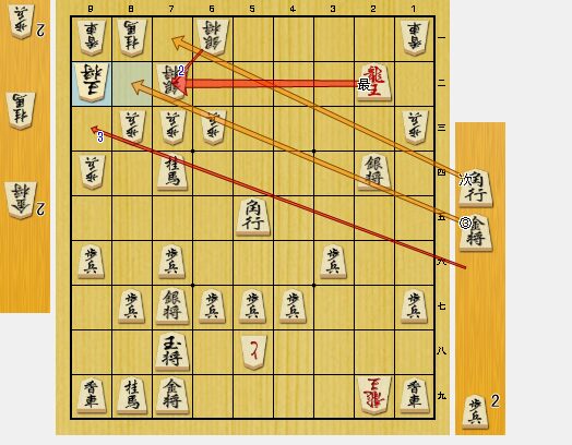 図6では、相手の玉に詰みがありました。7二龍・同銀・9三銀打・同玉・7一角打・8四玉・7五金までです。しかし、9三銀打と捨てる手が見えず、私は、7一角打としました。