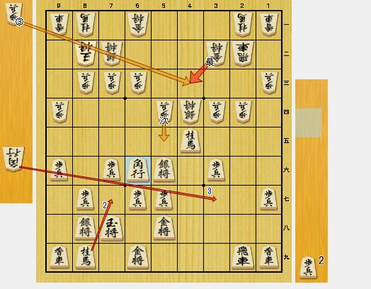 図4の6六角打が3度目の悪手でした。4三歩成を狙った手ですが、次の7三桂で飛車が捕獲されてしまいます。