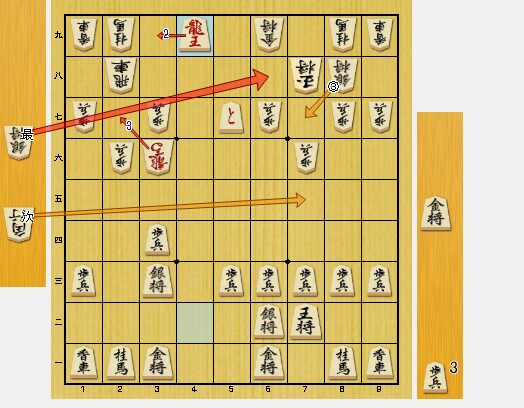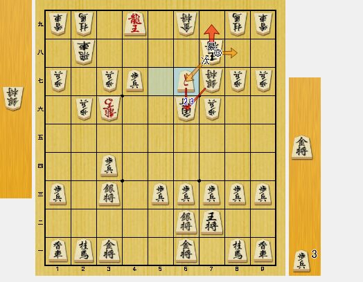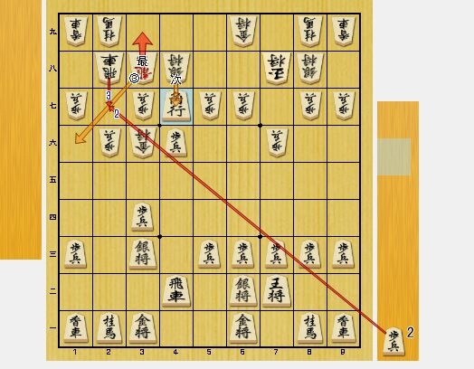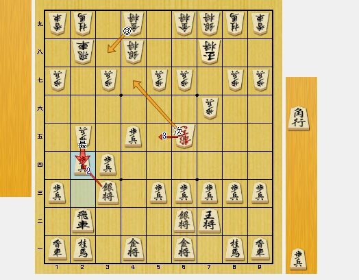 図2では、2四歩をついて、逆棒銀を狙ってみました。ただし、馬もいるので、銀が成りこむのは難しいと思っていました。