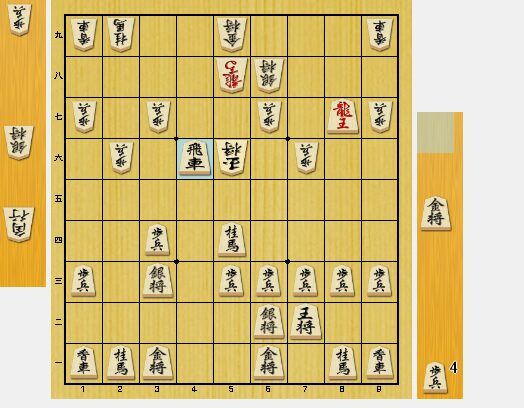 図4では、龍もできて優勢になりました。相手は、歩切れなので4七歩と垂らして、と金攻めが厳しいです。