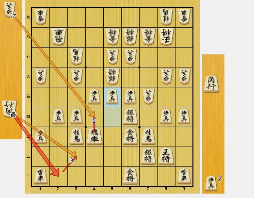 図1では、すでに陣形差がついており、私が有利です。相手の方は、2四歩から動いてこられました。