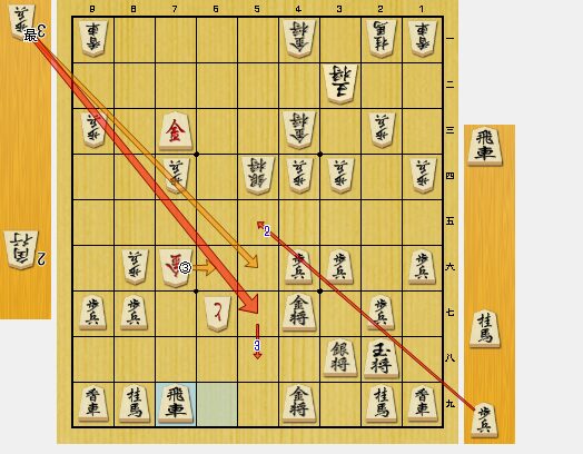 図7の5四角と歩を取ったのは、相手の方の悪手でした。角がそれたので、私に攻めるチャンスが回ってきました。