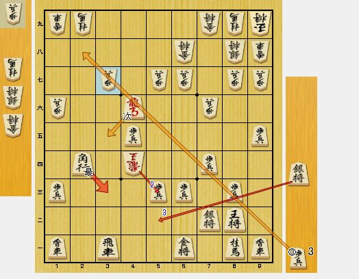 図3では、3三角が最善手でした。8八角成と切る手を見せています。しかし、この手が見えなかった私は、3五角と龍に当てました。