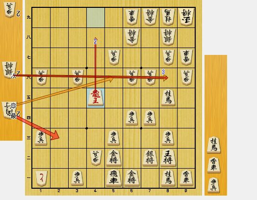 図7では、5二金と受けるか、9七香車と攻めるかが最善手でした。私は、7六桂馬と跳ねたために、5三龍とされて、敗勢になりました。